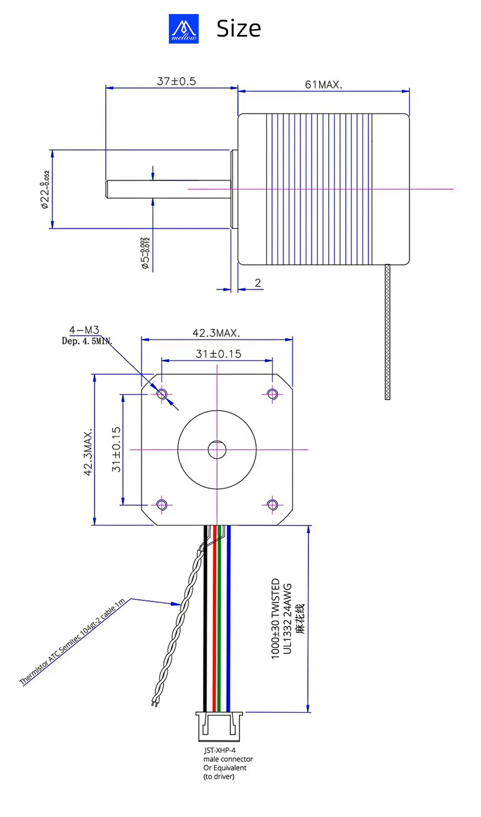 Each unit includes a 1-meter cable that connects both the motor and its thermistor. The wiring is pre-terminated with a 4-pin JST-XH connector for secure and hassle-free installation.