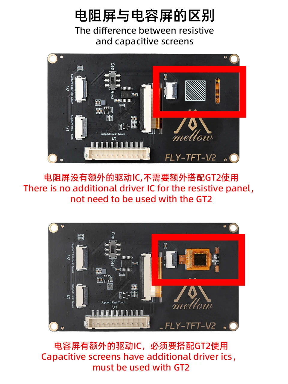 When using the TFT35 capacitive touch screen with Fly PI V2/C8/Raspberry Pi, you need to connect the G2T adapter board.