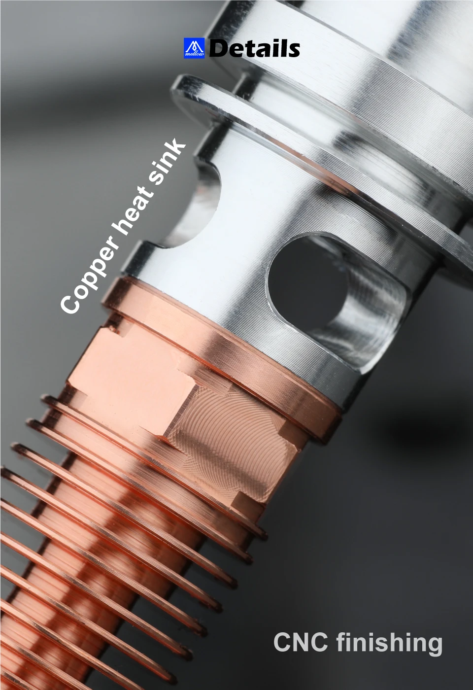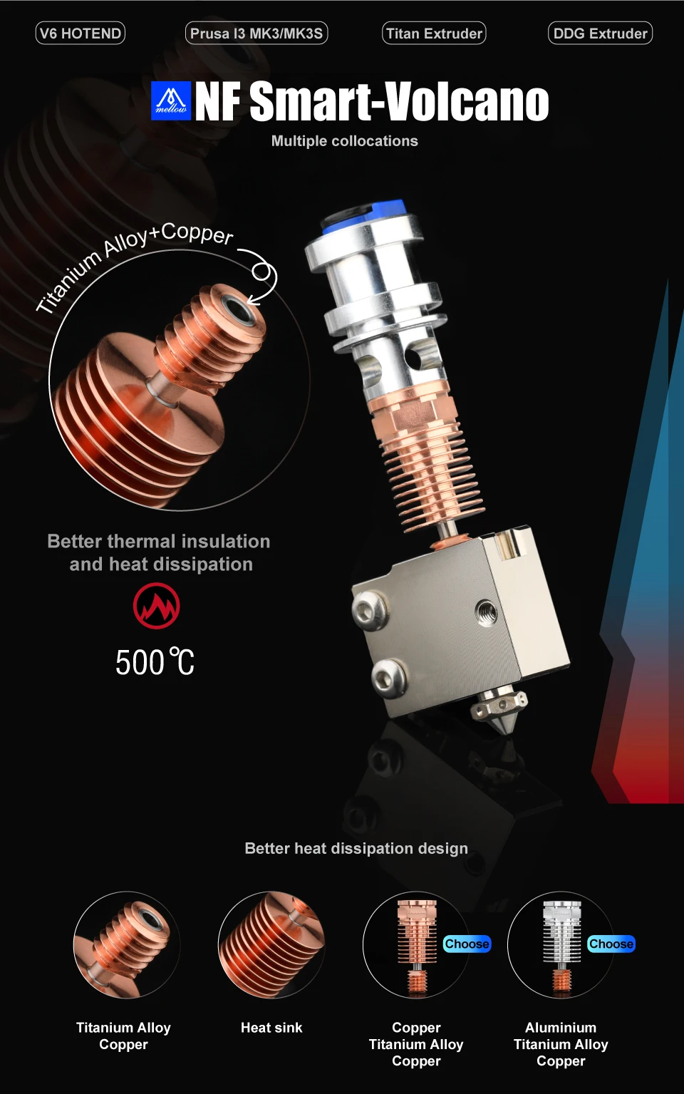 This is a drop in All Metal Conversion kit for Volcano Printers. It requires absolute zero modification of the printer to install. Our uniquely designed cooling block reduces the area requirements for the heat sink. By installing thin titanium tubes inside the cooling block, heat can be dissipated faster while providing excellent thermal insulation between the heater and the cooling block. According to our test, the effect is the same as the crazy hot end, and it can print perfectly for PLA, ABS, PETG, TPU and other materials. For the aluminum heat sink, it means that the hot end can be lighter, and the copper plus heat sink will have a slight increase in weight, but the heat dissipation effect is better.