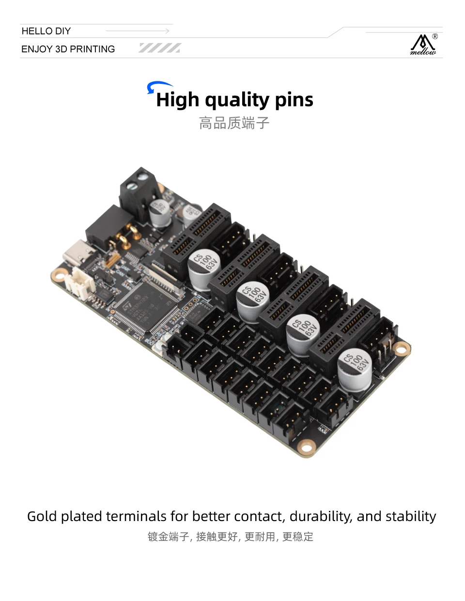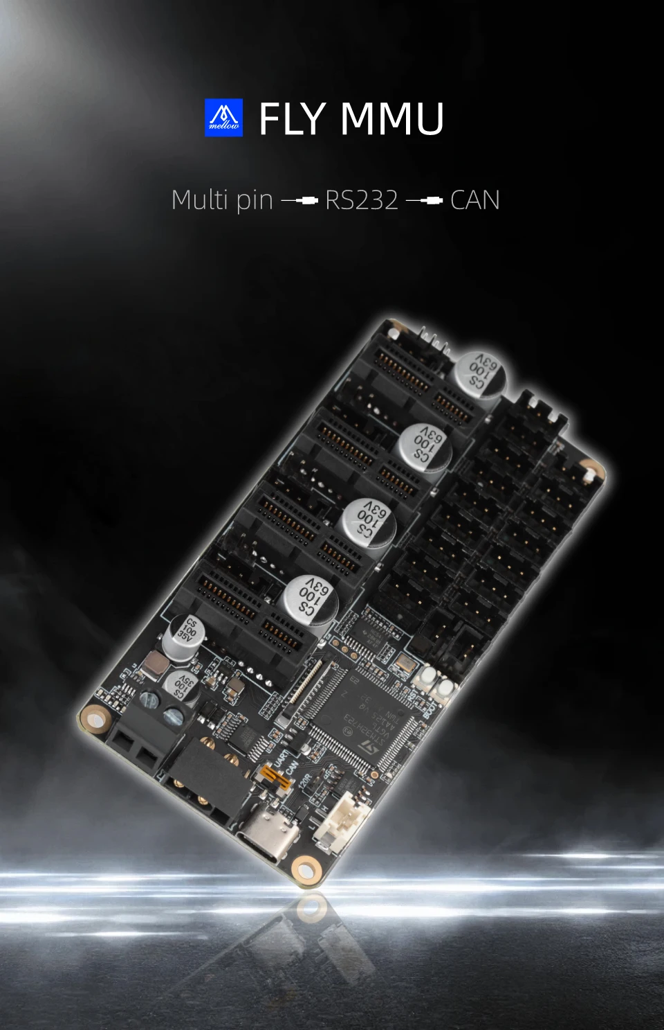 The Fly-MMU is a high-performance multifunctional toolboard tailored for multi-color printing in 3D printers and automation systems. It features an integrated, robust 550MHz H723 microcontroller that accommodates up to four TMC stepper motor drivers, all while supporting a 48V high-voltage drive system. The board natively incorporates 11 limit switch inputs and allows for expansion through FPC to add an extra 16 limit switches, along with offering four servo control outputs. Designed to be compatible with Klipper firmware, this toolboard also presents CAN bus and RS232 connection options to facilitate versatile communication and control strategies.