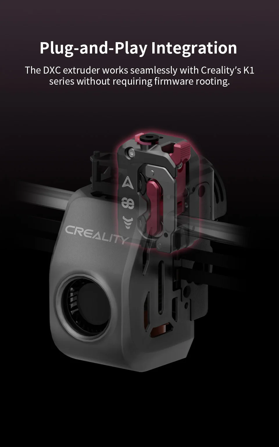 Designed exclusively for the Creality K1, K1 Max, and K1C, the DXC Extruder redefines precision and reliability in 3D printing. Featuring advanced dual-gear mechanics, adaptive pressure regulation, and ultra-durable coated components, it ensures smooth, consistent filament feeding for exceptional printing performance.