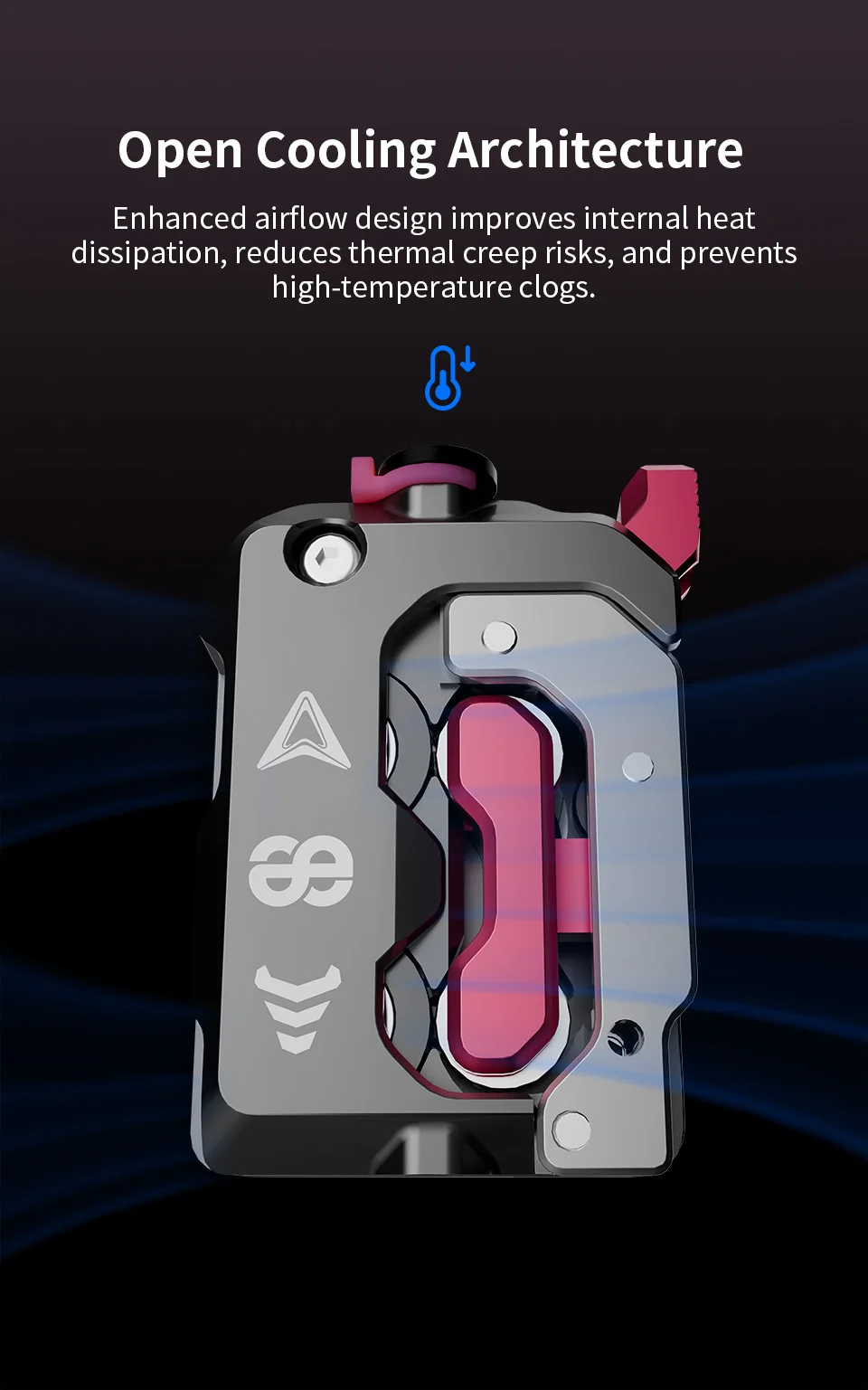 The extruder’s open airflow design enhances internal cooling, reducing thermal creep and clogging risks. Combined with RNC-coated HV3300 gears boasting a 3x extended lifespan, the DXC is built for demanding, long-duration print jobs.