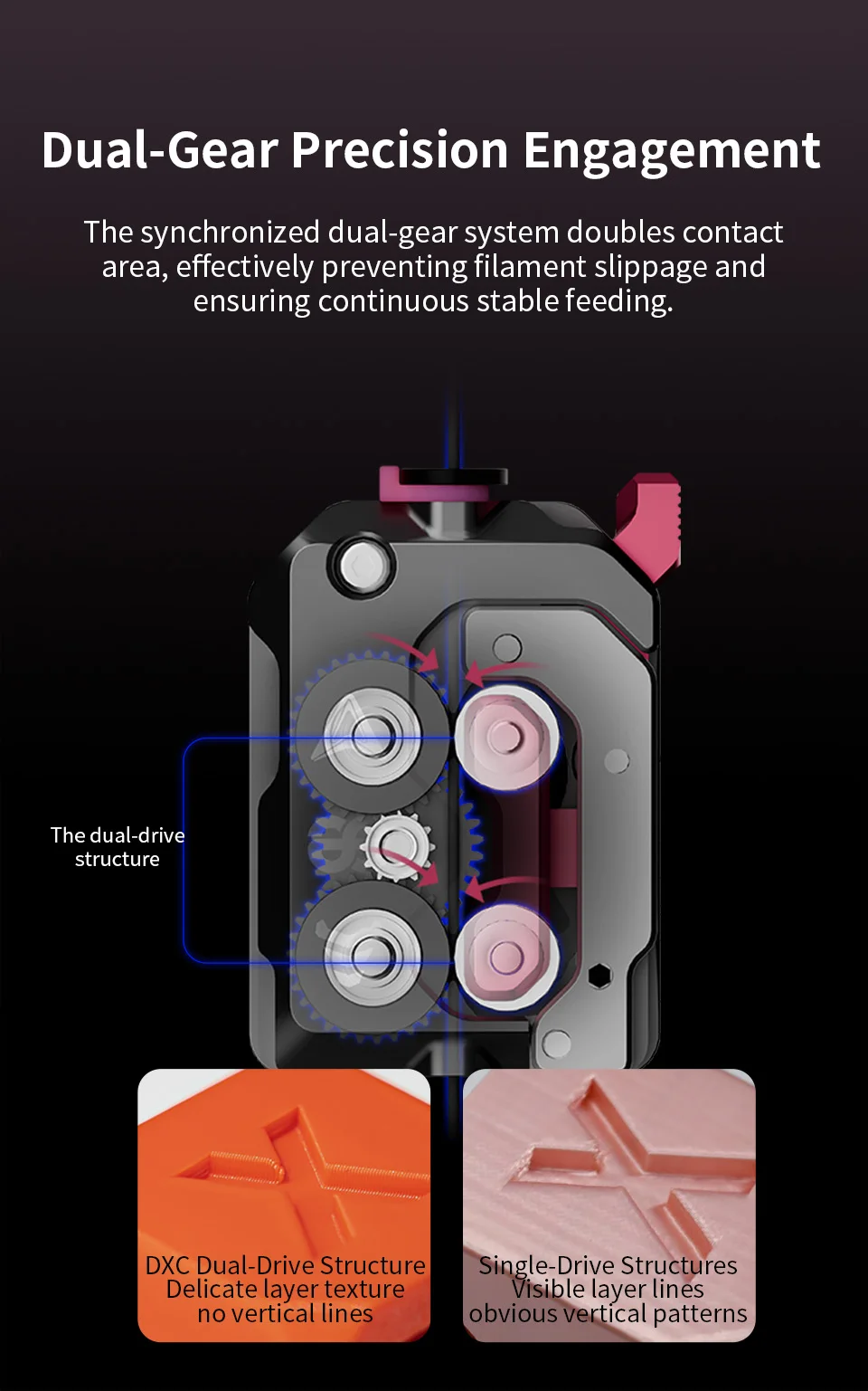 Dual-Drive System: Prevents filament slipping for stable and reliable extrusion.