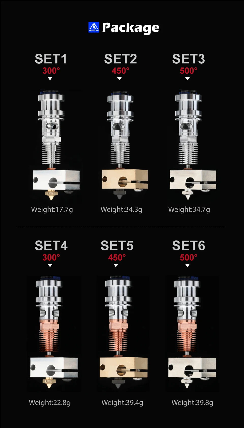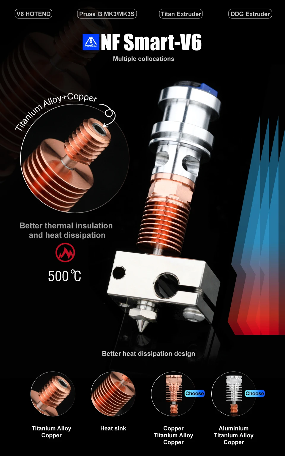 This is a drop in All Metal Conversion kit for V6 Printers. It requires absolute zero modification of the printer to install. Our uniquely designed cooling block reduces the area requirements for the heat sink. By installing thin titanium tubes inside the cooling block, heat can be dissipated faster while providing excellent thermal insulation between the heater and the cooling block. According to our test, the effect is the same as the crazy hot end, and it can print perfectly for PLA, ABS, PETG, TPU and other materials. For the aluminum heat sink, it means that the hot end can be lighter, and the copper plus heat sink will have a slight increase in weight, but the heat dissipation effect is better.