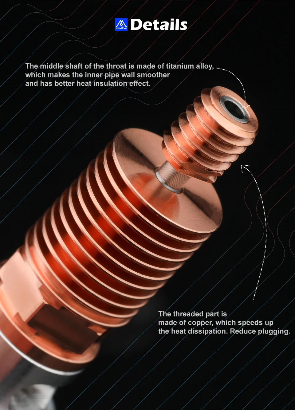 The newly upgraded titanium tube has bi-metal heat insulation. The m6 thread is made of copper, and the middle tube is made of titanium. The copper m6 thread helps the filament in the titanium tube to melt more easily and increase the flow rate. The titanium tube is used in the middle to reduce upward heat conduction and print blockage. , to improve print quality. It has better heat resistance than using stainless steel pipes. Heatsinks use aluminum or copper to help thermally dissipate heat quickly to the heatsink. Improve heat dissipation efficiency.