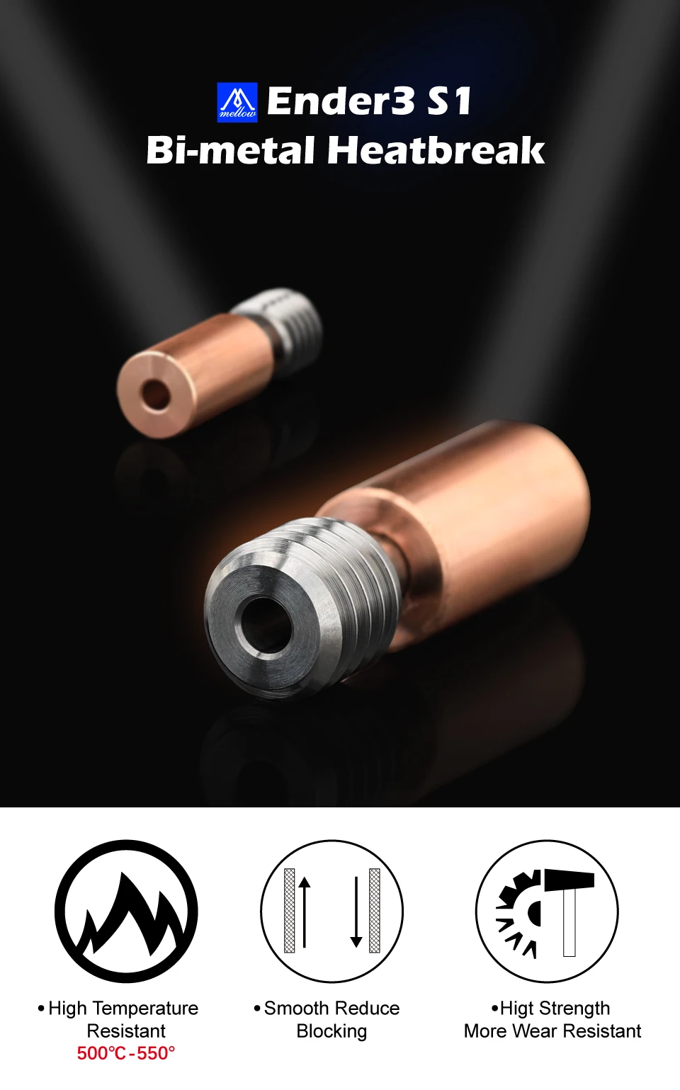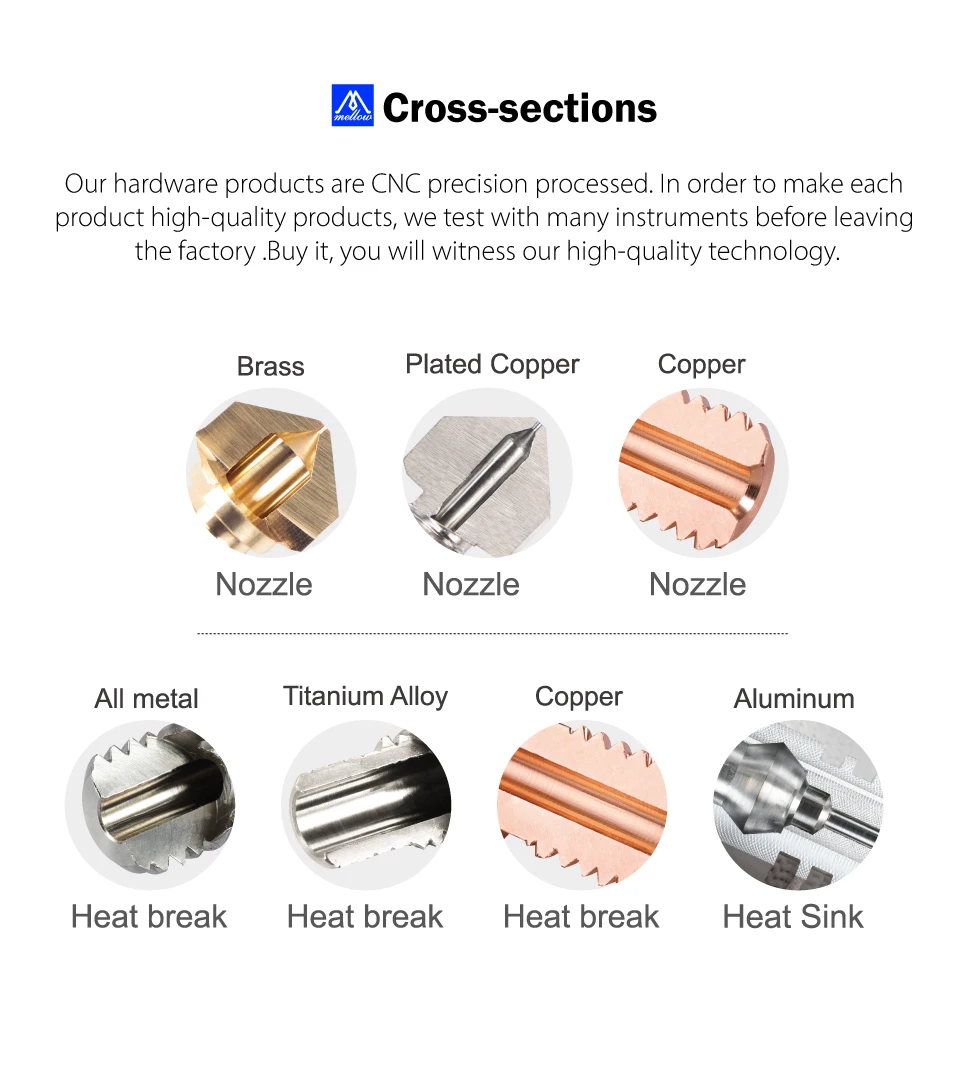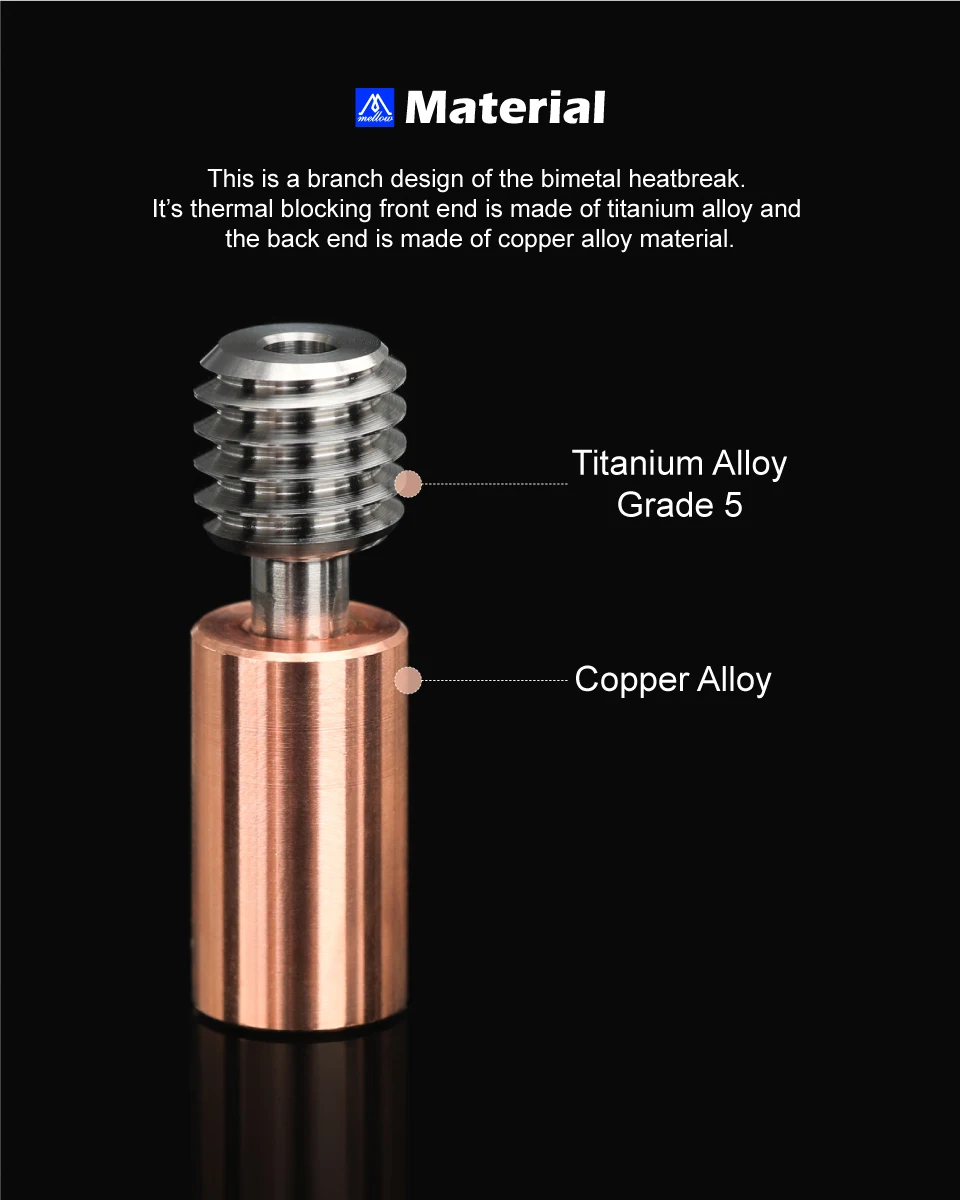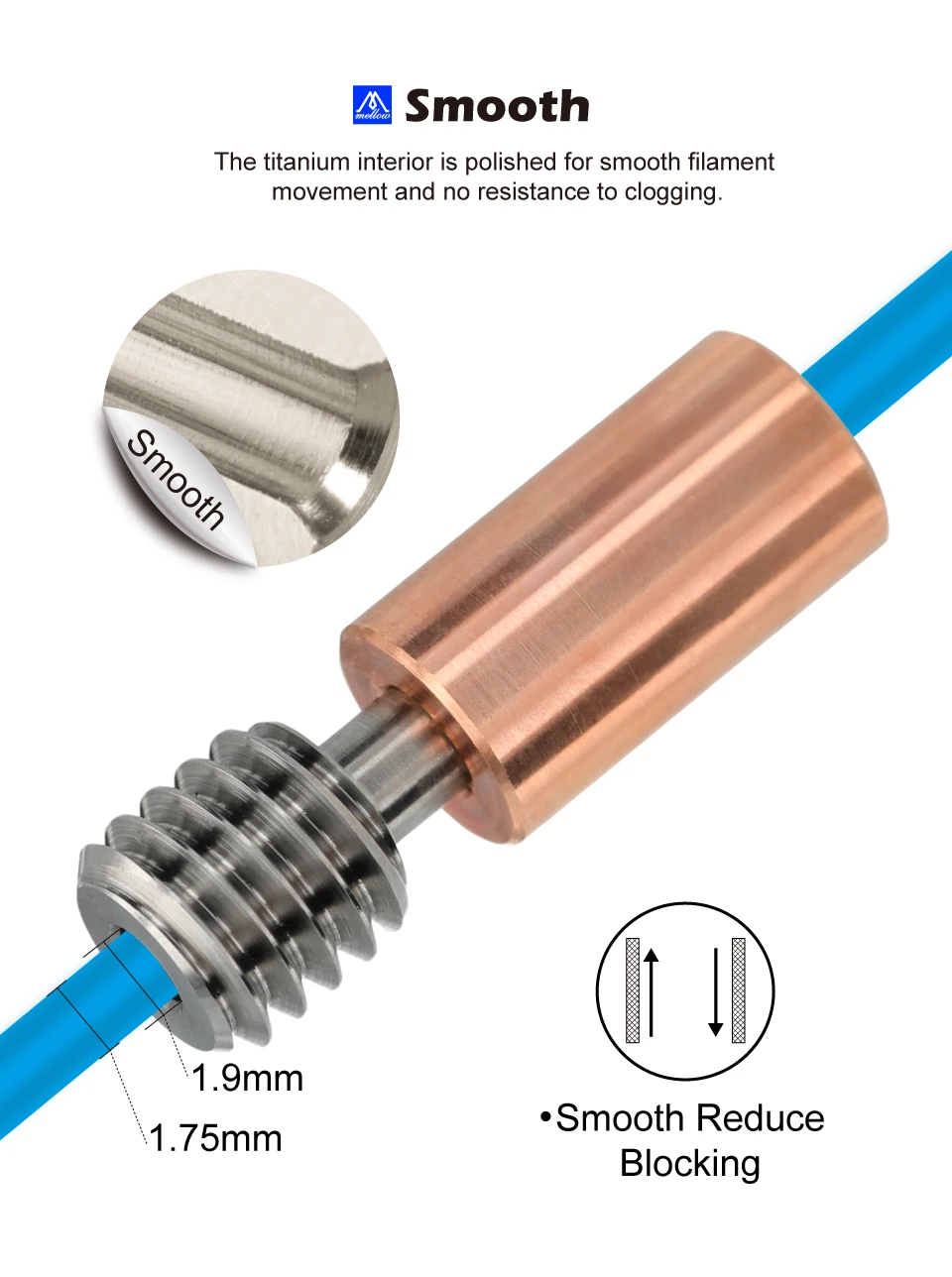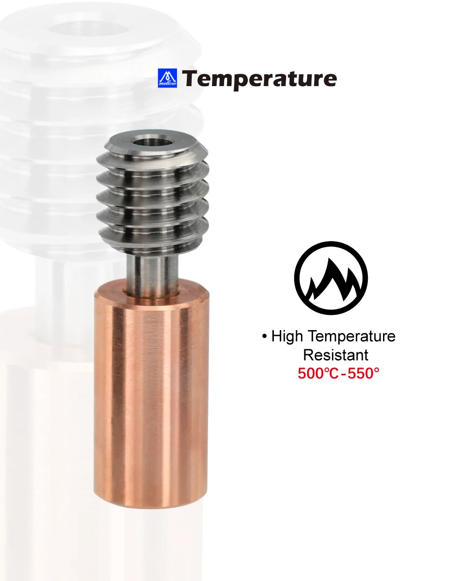 Two kinds of metals are used to make the throat tube. Titanium is used in the front part of M6 to reduce thermal conductivity, while copper is used in the back part of M6 to help heat dissipation. The thermal barrier performance is better than that of the original V6 and the printing quality is improved.