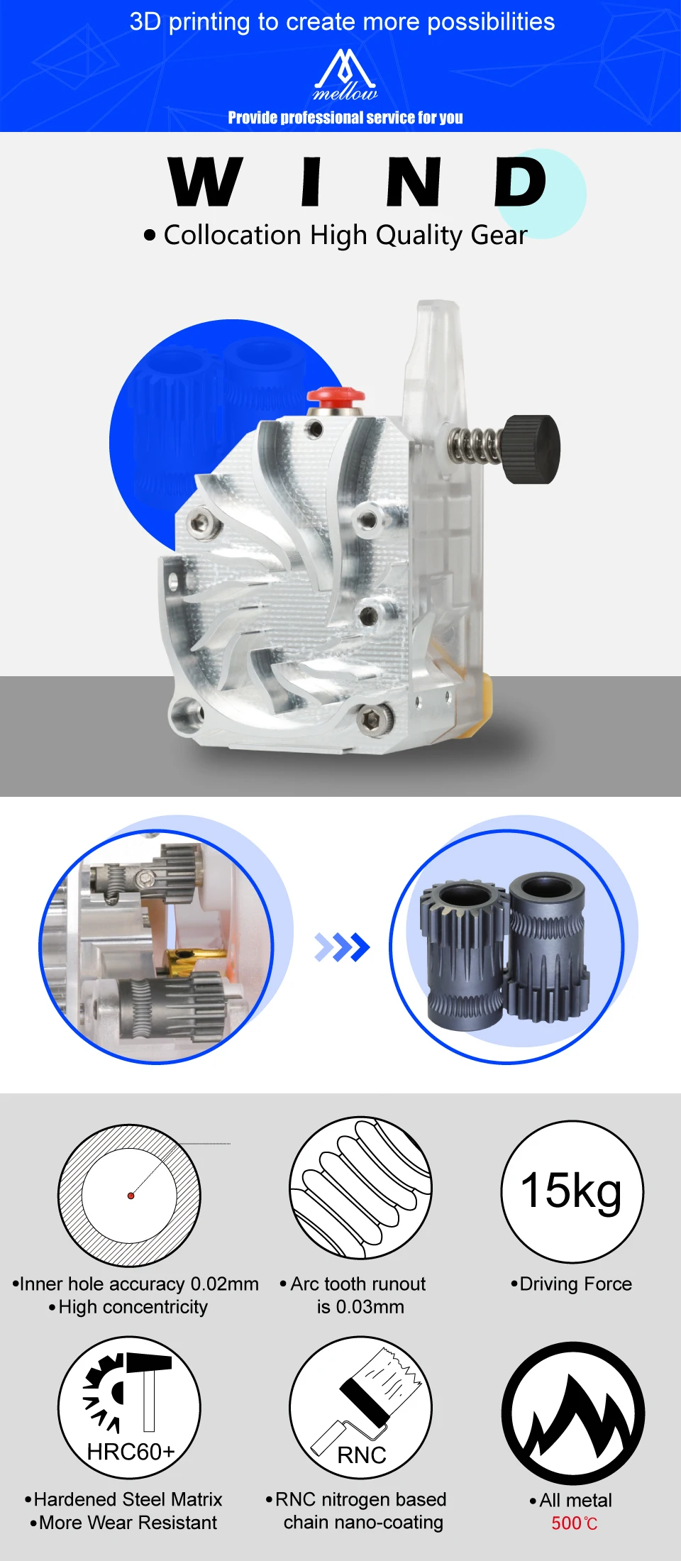 The RNG-WIND RNC transmission ratio is 3: 1, making the extruder more powerful and easier to squeeze the filament to reduce clogging and cause printing failure.hether you require high resolution prints with small nozzles or high-flow prints with big nozzles the optimized gearing ratio combined with our industry leading drive gears provides unparalleled pushing power and lightning fast retractions in a lightweight and compact package.