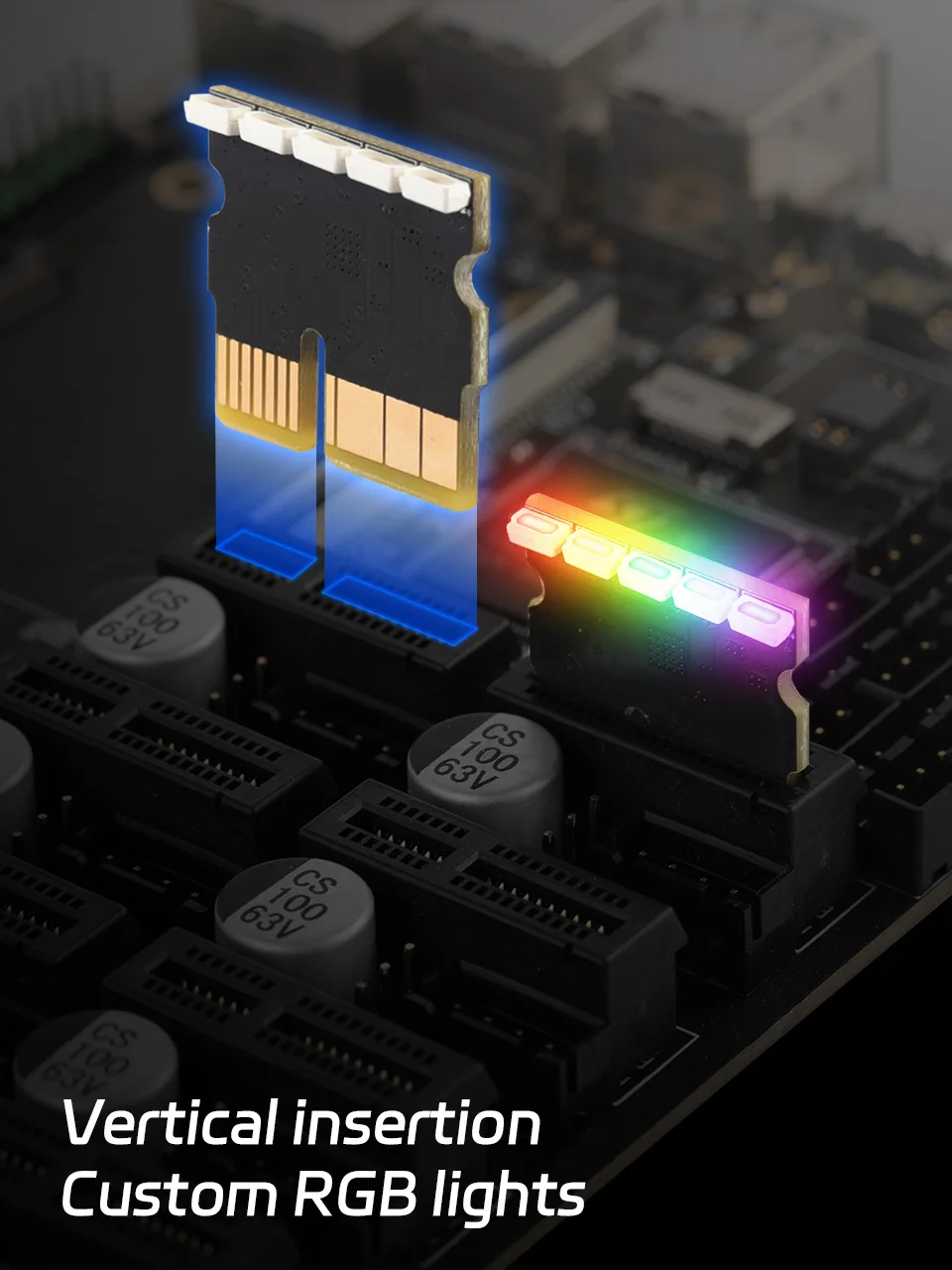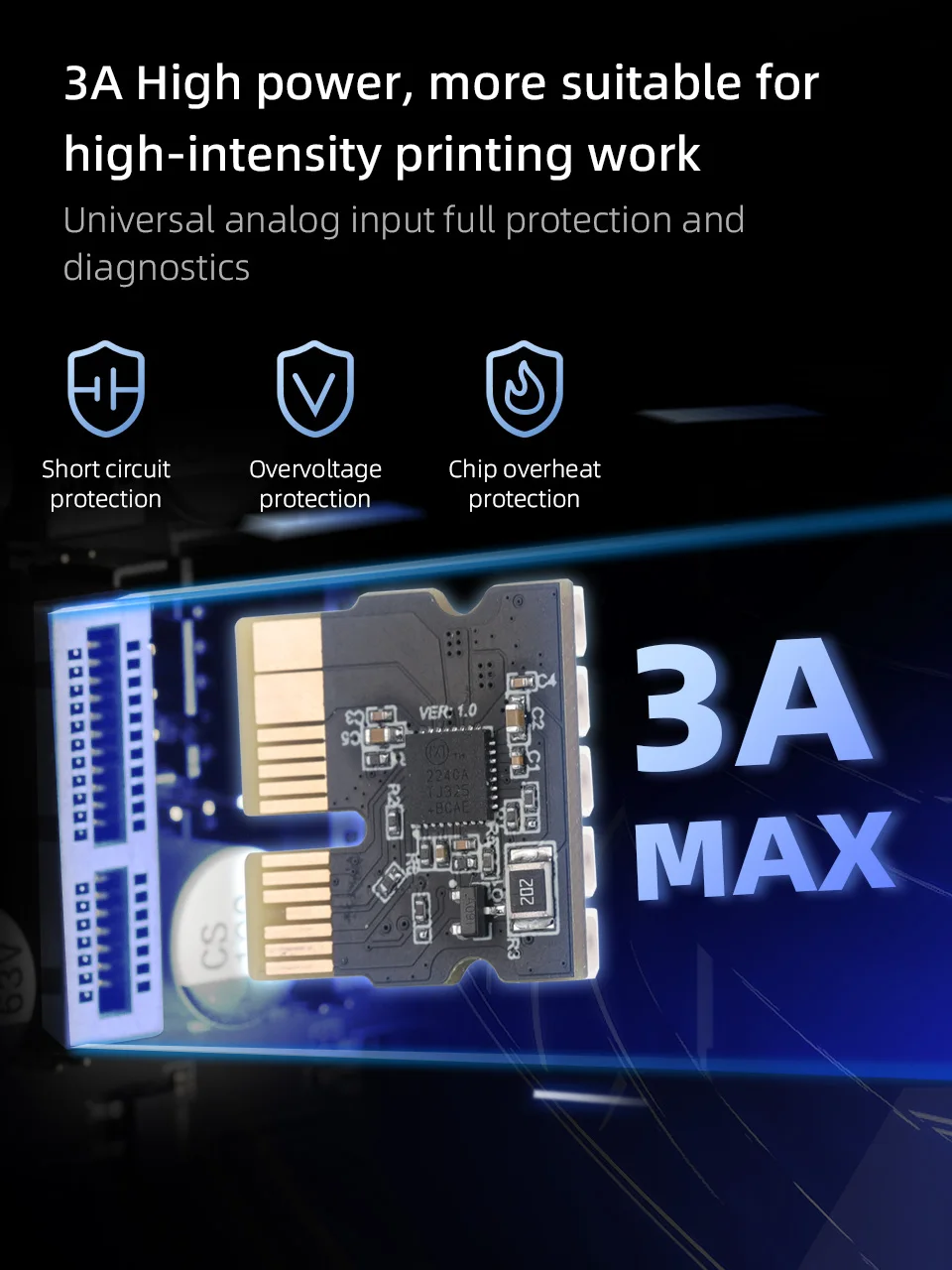 This driver features a unique vertical installation design that significantly improves heat dissipation, addressing the common issue of insufficient cooling in traditional TMC2240 drivers. Additionally, it includes built-in RGB lighting, with support for up to 5 RGB lights controlled via the DP5 and PROX10 mainboards. Users can customize the lighting effects based on their personal preferences, adding a personalized touch to the device.